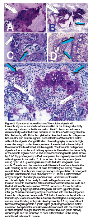 A quantum leap towards the mechanistic understanding of the phenomenon of "Tissue Induction", 10 has been the dissociative extraction and reconstitution of the bone matrix components which, when combined, trigger the bone induction cascade.31,32 The experiments of AH Reddi, then at the NIH Bone Cell Biology Section31,32 dissociatively extracted demineralized bone matrix in chaotropic agents such as 4M guanidinium hydrochloride or 6M urea resolving an insoluble and inactive collagenous matrix signal and solubilized extracted proteins, or soluble signals.33