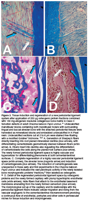 Pre-clinical studies in the Chacma baboon Papio ursinus showed the induction of bone by the bone morphogenetic proteins (BMPs), pleiotropic members of the TGF-ß supergene family.16,45,48,50 Mammalian naturally derived BMPs and recombinant human BMPs (hBMPs) induce de novo bone formation (Fig. 2). Proteins act as soluble signals for tissue morphogenesis, sculpting the multi-cellular mineralized structures of the periodontal tissues with functionally oriented periodontal ligament fibers inserting into newly formed cementum (Fig. 3).16,25