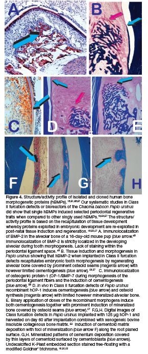 Tissue morphogenesis induced by hOP-1 and hBMP-2 is qualitatively different when the morphogens are applied singly. This indicates that the structure/activity profile amongst BMPs is controlling pleiotropic tissue induction and morphogenesis (Fig. 4). 25,56,57,59, Furcation defects of Papio ursinus with root surfaces long-term exposed to periodontal disease implanted with doses of gamma-irradiated hOP-1 resulted in complete regeneration of the furcation defects with prominent induction of cementogenesis with Sharpey's fibers embedded within the newly formed cementum.58,59
