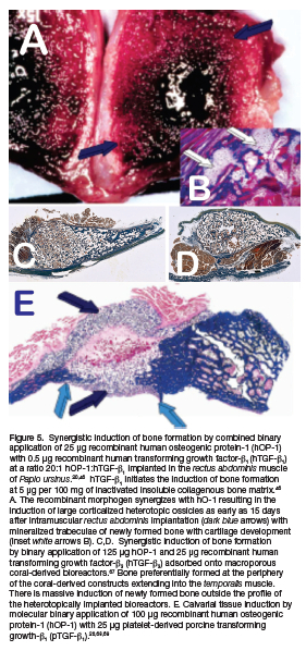 Our Unit has been amongst the first to propose heterotopic and orthotopic regenerative studies combining homologous but molecularly different morphogenetic proteins. Binary applications were also applied in periodontal regenerative studies. 57,59,66 Our first heterotopic combination study yielded unprecedented results showing a synergistic interaction between recombinant human osteogenic protein-1 (hOP-1, also known as hBMP-7) and relatively low doses of hTGF-ß1 (Fig. 5). 46,67