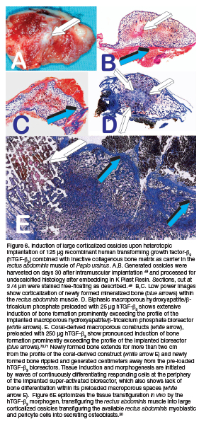 Reconstituted coral-derived macroporous bioreactors with 125 hOP-1, 125 hTGF-ß3 and binary applications of 125 hOP-1 and 25 hTGF-ß3 in the ratio of 5:1 hOP-1:hTGF-ß3 were implanted in heterotopic intramuscular sites of the rectus abdominis muscle of Papio ursinus. Results showed prominent and substantial induction of bone formation extending far beyond the profile of the implanted super activated bioreactors (Figs. 5c,d). 67 Of interest, qRT-PCR showed prominent induction of TGF-ß3 mRNA with relatively low expression values of OP-1 mRNA.67,69