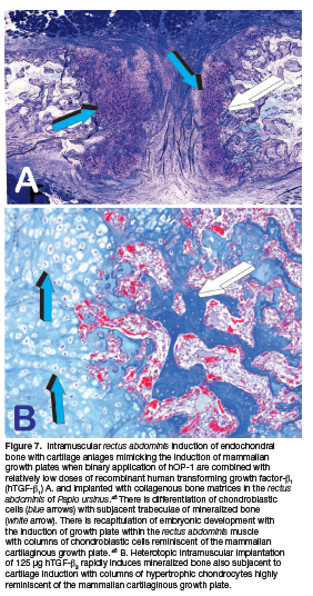 We also reported that synergistic binary application of hOP-1- and hTGF-ß1 in the ratio 20:1 respectively, initiate the heterotopic induction of rudimentary embryonic growth plates (Fig. 7a). This has indicated that the "memory" of developmental events in embryo is re-deployed postnatally by morphogen combinations (Fig. 7a). 46,69 Of interest, tissue induction and morphogenesis by TGF-ß3 applied singly in heterotopic rectus abdominis intramuscular sites also morphogenizes columnar chondrocytes as seen in the mammalian growth plate (Fig. 7b).