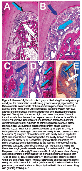 Recent time-study experiments combined morphological analyses to a time point molecular study of Class II furcation defects in Papio ursinus super activated by TGF-ß3 in Matrigel®Matrix. 60 The combined morphological and molecular analyses have indicated that relatively low doses of hTGF-ß3 (75 hTGF-ß3 in 600 Matrigel®Matrix) set into motion the in vivo development of multiple tissues and multicellular organoids within the implanted furcation bioreactors (Fig. 2.8).60