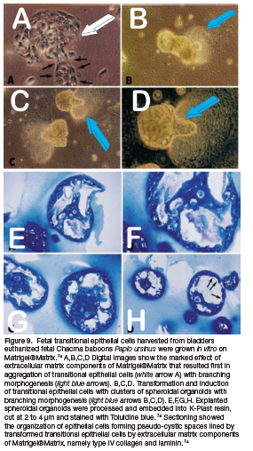 The use of Matrigel®Matrix originally developed as a matrix substratum for in vitro research experiments 73 was later used to deliver recombinant hOP-1 in the subcutaneous bioassay in rodents.74 Matrigel is a soluble extract of the Engelbreth-Holm-Swarm tumor which gels at room temperature to form a reconstituted basement membrane gel. 73 Matrigel promotes differentiation of a variety of cells. 73,75 Our studies evaluated the induction of organoids of transitional epithelial cells harvested from baboon fetal bladders and grown on Matrigel®Matrix (Fig. 9).74