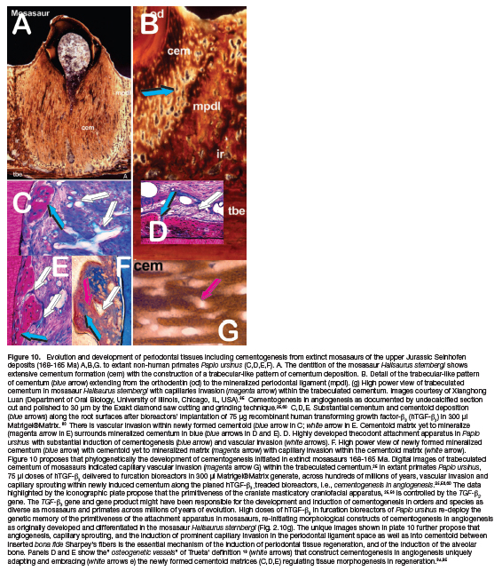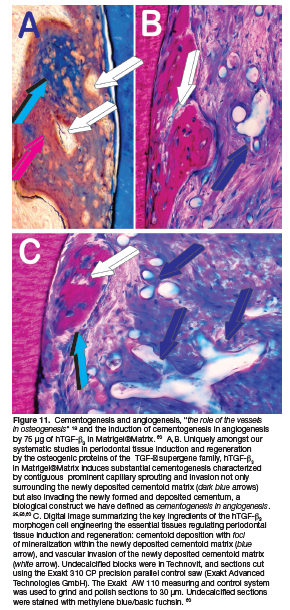 A novel regenerative approach but in primates only is the induction of periodontal tissue regeneration with substantial cementogenesis by doses of the recombinant human transforming growth factor-ß3 (hTGF-ß3). 25,56,60 In the nonhuman primate Papio ursinus periodontal tissue induction and regeneration develops as a mosaic structure in which the osteogenic proteins of the TGF-β superfamily singly, synergistically and synchronously initiate and maintain tissue induction and morphogenesis.43,56,59
