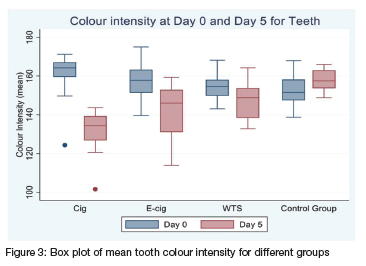 This study was rather unique as it used different smoking types and compared these. In many other studies, the researchers demonstrated the effect of cigarette smoking on the staining of teeth, but very few have investigated the effects of e-cigarette and waterpipe smoke on teeth. For this study, the sample selection was also random, and it was observed that there was a difference between baseline colour readings in all the exposure groups as the sample of teeth were from different people. The importance of similar variables at baseline is thus important as difference can impact on the study outcomes.