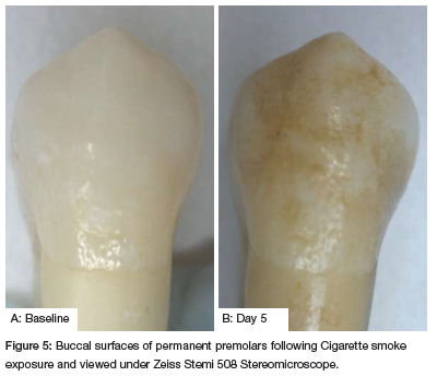 Group A: The smoking machine was set, and a Malboro cigarette filter tip was attached to the polyurethane pipe, sealed using a mouth tip and electrical tape. The cigarette was placed inside a flask to eliminate any air that may accelerate its burning. The Clements high suction unit was switched on, the cigarette lit, and the suction unit was switched off when the cigarette had burned up to the filter tip. The time for the consumption of each cigarette was also measured. The smoke produced during this action, was transferred to the glass container via the polyurethane pipe. A period of 10 minutes was allowed between each cigarette to allow the smoke to be circulated and its chemicals deposited on the teeth and composite discs. This smoking cycle was repeated 10 times per group of teeth and composites as there were 10 cigarettes per pack for 5 days.