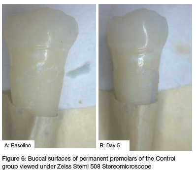 Colour readings were taken on both buccal and lingual surfaces of each tooth and an average per tooth was calculated. Readings were documented as an intensity mean value which indicates the hue of the tooth colour. All samples (tooth and composite) had readings done at baseline (Day 0) and on the 5th day of exposure (Day 5) (Figure 3).