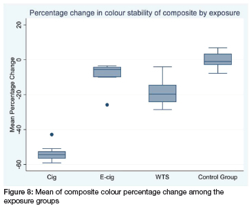 The mean composite colour % change among the four groups is shown in the box plot (Fig 8 below). The negative change is indicative of a darker colour intensity. The darkest colour showed in group A exposed to cigarette smoke (mean colour change -53 and SD=4.45), followed by the group C exposed to waterpipe smoke, then by group B, the E-cigarette sample. The smallest percentage change in composite colour was shown among group D, the control group (Fig 8 below).