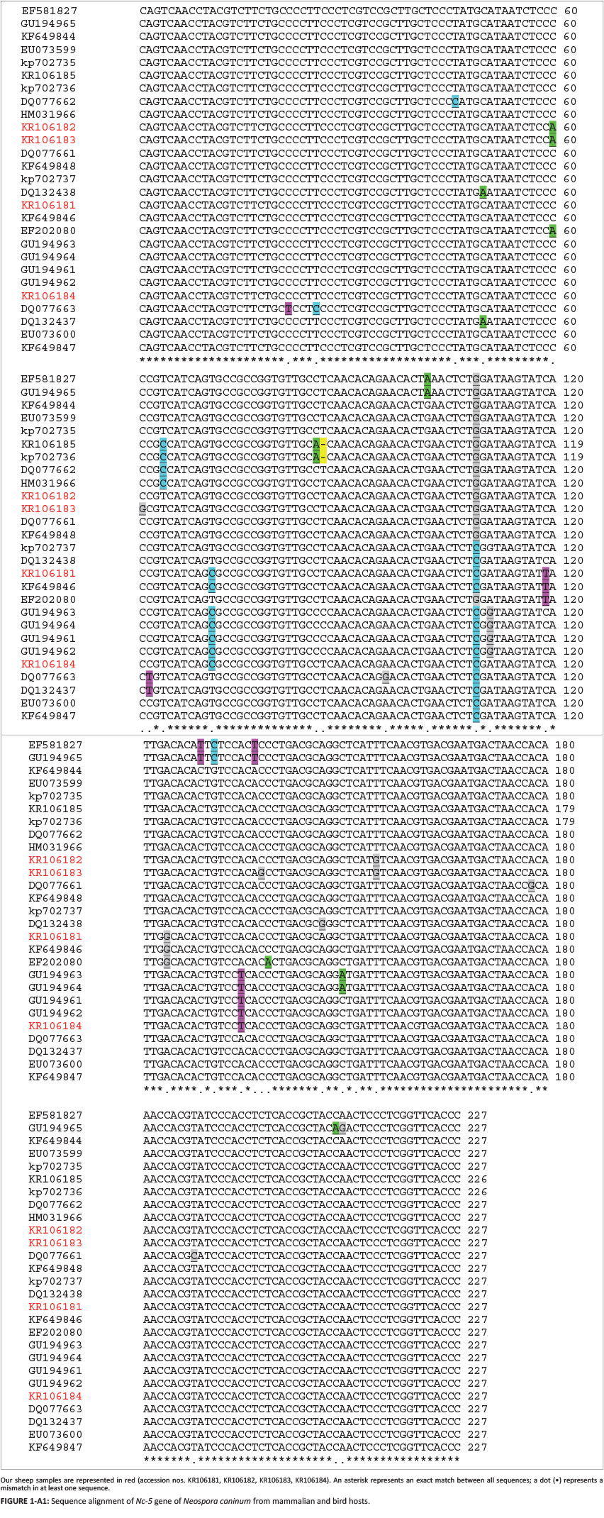 In the current study, we used the Nc-5 gene for detection and phylogenetic analysis of N. caninum. This gene is repeated in the N. caninum sequence (Al-Qassab et al. 2010); hence, it is presented as a highly sensitive and specific gene for detection of neosporosis (Kaufmann et al. 1996; Yamage et al.1996). The earlier study in this regard was conducted by Yamage et al. (1996), who compared the sensitivity and specificity of different primers for diagnosis of N. caninum. In this study, five forward (Np1, Np3, Np5, Np7, Np21) and four reverse (Np2, Np4, Np6, Np8) oligonucleotide primers that derived from the Nc-5 genes were compared for the detection of neosporosis in experimentally infected mice. Among 19 combinations of forward and reverse primers, the Np21/Np6, Np7/Np6, and Np2l/Np4 primer pairs were able to detect at least 10 pg genomic DNA with a specific single band (Yamageet al. 1996). The Nc-5 gene can also discriminate N. caninum from other related apicomplexan parasites (Toxoplasma gondii and Sarcocystis species) (Kaufmann et al. 1996). Thus, the Nc-5 gene has been used as a highly sensitive and specific gene for detection of neosporosis (Almerıa et al. 2002; Dubey et al. 2014; Hughes et al. 2006; Paula et al. 2004; Yamage et al. 1996). Hence, we selected the Nc-5 gene for sensitive and specific detection of neosporosis in the current study.