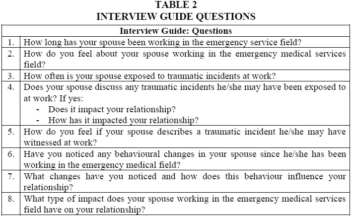 A pilot study was conducted before the commencement of data collection with a sample of 2 participants who did not form part of the study's sample population (De Vos et al., 2011). The pilot study was conducted to: (1) identify any potential problems with the research design; (2) review any shortcomings and the trustworthiness of the interview guide; (3) to bring about adjustments where necessary (Terre'Blanche, Durrheim & Painter, 2006). The spouses responded to individual in-depth semi-structured interviews to non-directional open-ended questions, which addressed major concerns and perplexities to be explored around secondary trauma experienced by the spouses of ESP (see Table 2) (Creswell, 1998). Relevant data were gathered from the eight participants, or until data saturation was reached (De Vos et al., 2011). Interviews were audio-recorded with the permission of the participants.
