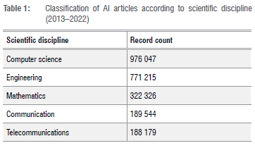 According to the WoS, 1 536 741 documents on the subject of AI were published in the past 10 years. Table 1 shows the top scientific disciplines that attract research documents related to AI. The various branches of computer science dominate the domain, followed by engineering and mathematics. It should be mentioned that articles may be categorised into more than one scientific discipline.