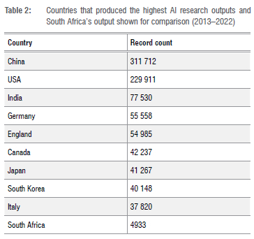 Table 2 shows the most productive nations in the field of AI research, as well as South Africa's AI research output. The People's Republic of China dominates with 311 712 documents, with the United States of America ranking second with 229 911 documents and India third with 77 530 documents. South Africa published 4610 papers during this period.