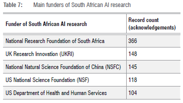 Table 7 shows the main funders of AI research in South Africa, with the National Research Foundation (NRF) of South Africa topping the list with 366 acknowledgements. It is noteworthy that all other funders mentioned by the authors from South Africa are international organisations in the UK, China and the USA.