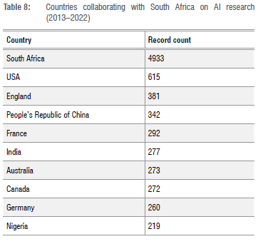 Table 8 shows the countries that collaborated with South Africa in the field of AI research, with the USA, England and China being the main collaborating countries.