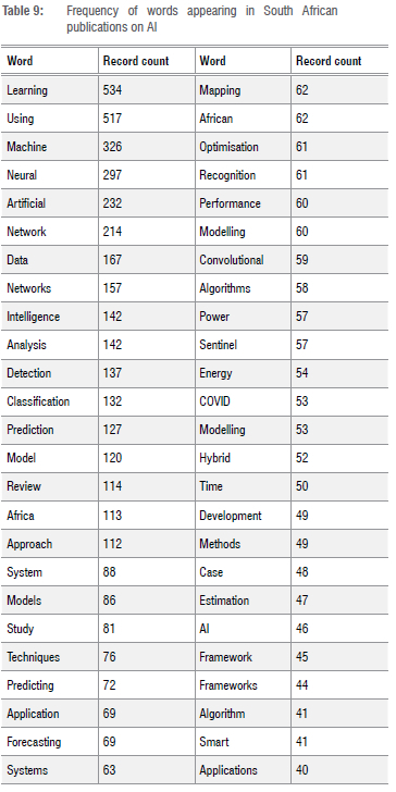 Table 9 lists the most often appearing words in the titles of publications on AI research from South Africa.