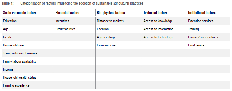 The adoption of SAPs, or any technological innovation, necessitates adequate monetary assistance and access to incentives (Table 1). Lack of accessibility to credit is an enormous obstacle to the adoption of SAPs.28,29 For example, credit-constrained farmers may be less inclined to adopt SAPs that need monetary expenditures, such as fertiliser and seed varieties, than SAPs that do not, such as manure or crop rotation.33 The high levels of SAP abandonment are statistically consistent with anecdotal evidence from Zambia, which shows that most "adoption" was based on the anticipation of receiving free inputs, and that after these incentives were no longer given, abandonment occurred.20,29 Therefore, access to credit and incentives through institutional or non-institutional sources is critical to the adoption of SAPs.