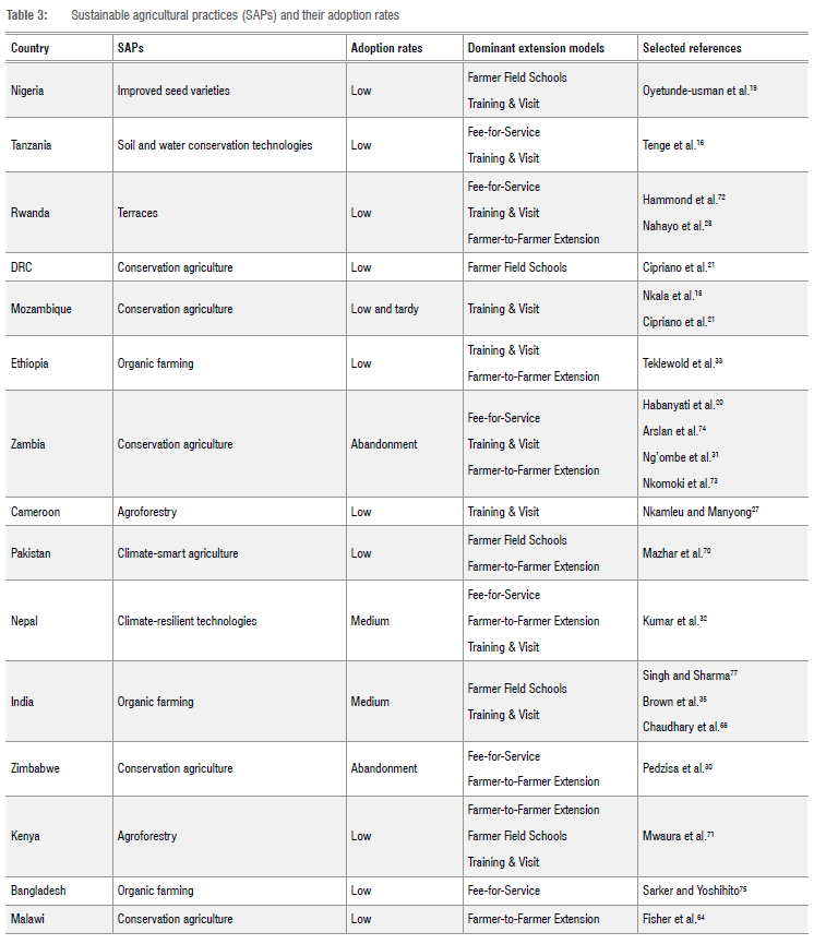 The quest for the widespread adoption of SAPs (climate-smart agriculture) was found to be complicated in Pakistan.70 In Nepal, Kumar et al.32 found that the United States Agency for International Development (USAID)-led Knowledge-Based Integrated Sustainable Agriculture in Nepal (KISAN) recipient farmers adopted SAPs (climate-resilient technologies) instead of KISAN non-beneficiary farmers. SAPs (organic farming) are progressively more widespread with low-to-medium adoption and are stable in India.2,76,77 However, smallholder farmers continue to cultivate less than 1 ha of land under SAPs.76 Similarly, a study in Zambia by Habanyati et al.20 revealed that smallholder farmers who had adopted conservation agriculture were cultivating tiny portions of land whilst larger portions were under conventional agriculture. This scenario is a reflection of imperfections identified in the extension models implemented in these particular countries. The research results reveal that no specific extension model is adequate on its own, and that to generate impactful adoption rates of SAPs across the selected regions, a more integrative and contextualised strategy is imperative.