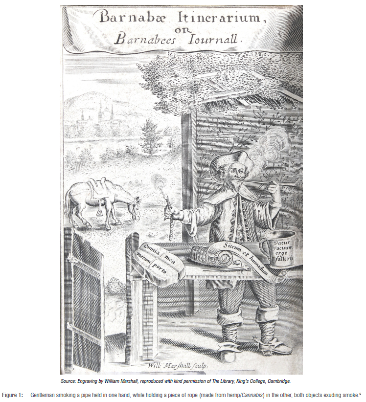 The need to be cryptic is reflected in an early 17th century engraving by William Marshall (Figure 1) in Barnabee's Journall..9 In this scene, a man is shown smoking a pipe held in one hand, and curiously burning a piece of rope in the other. It may not be coincidental that the latter material was manufactured from hemp. In its dry form (siccum in the engraving), when combusted, such rope would have exuded vapour. The scene may be considered to be at least a symbolic and cryptic reference to the smoking of cannabis, with a sense of humour.