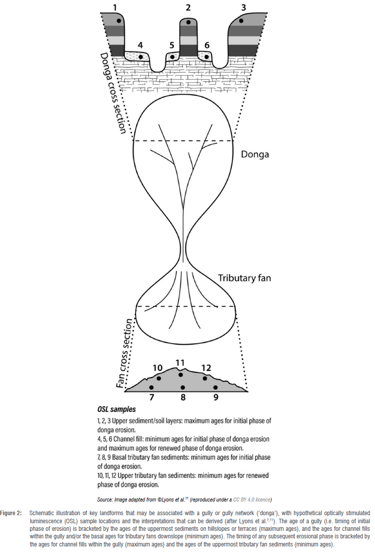 Across large parts of the southern African interior, soil erosion by water and/or wind is a widespread phenomenon. Soil erosion by water includes sheet, rill and gully erosion, the latter commonly leading to highly dissected land surfaces, both in colluvial (e.g. hillslope, pediment) and alluvial (e.g. river terrace, floodplain) landforms.1 In countries such as South Africa, Lesotho and Eswatini, individual gullies and coalesced gully networks ('badlands') are widely referred to as 'dongas', but in this Invited Commentary 'gully' is used as the catch-all term. Gullies range widely in size but can be up to several kilometres long, hundreds of metres wide, and tens of metres deep, and commonly provide extensive exposures of Quaternary sedimentary successions (Figure 1). Many of these successions provide evidence for past phases of sedimentation and palaeosol development interspersed with short phases of erosion (including by gullies), and may contain fossil faunal assemblages and/or archaeological artefacts (Figure 1F).2,3 Consequently, gullies provide abundant opportunities for a range of geoscientific, palaeontological and archaeological investigations.