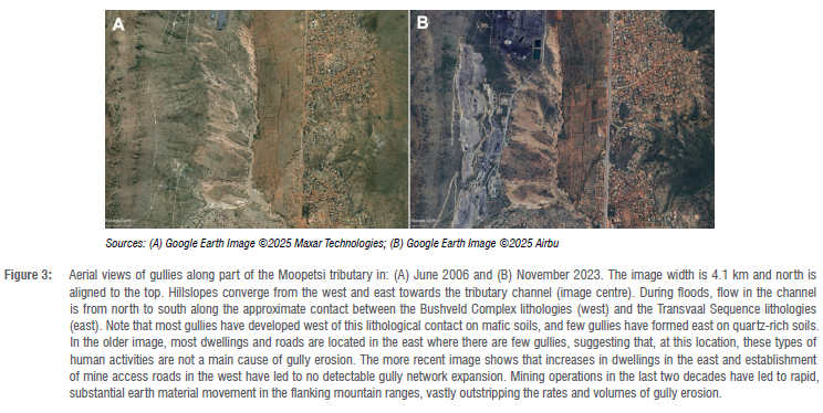 At some of the investigated sites, soil type and local base-level falls have exerted secondary controls on the specific locations, processes, rates and depths of gully erosion. For instance, marked soil textural contrasts along the Moopetsi tributary strongly control the erosional patterns, with gullies forming mainly along the western bank in soils derived from mafic lithologies of the Bushveld Complex, and many fewer located on the eastern banks in soils derived from the quartz-rich lithologies of the Transvaal Sequence (Figure 3). At Erfkroon, an initial ~15 m of incision occurred through the valley fill in response to climate changes, but the subsequent partial breaching of a dolerite sill exposed ~11 km downstream enabled an additional ~5 m of incision into bedrock.11,12 At all the investigated sites, deep erosion is ongoing, but at rates slower than might be commonly assumed; aerial imagery from the 1930s onwards shows that, at the landscape scale, the dimensions of many gullies (e.g. lengths, widths) have barely changed over many decades (Figure 3).