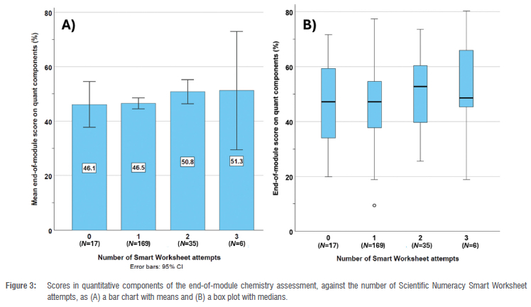 Student scores in the quantitative components of their end-of-module chemistry assessment were compared against engagement with the SNSW in terms of number of attempts (Figure 3). Because of the low sample sizes of students using the Smart Worksheet 0 or 3 times, only 1 vs 2 attempts were statistically compared. Students who engaged twice with the SNSW, regardless of performance, went on to score higher (50.8%) than those who made one attempt (46.5%), although this was not quite statistically significant: t(202) = 1.75, p = 0.082. The majority of students who consented to the study attempted the sheet only once, potentially limiting the statistical power of the comparison. The increase may indicate improved numerical confidence and abilities from repeated engagement, with the potential to transfer into other assessment contexts. However, it is also possible that students who engage more deeply with the SNSW are more engaged with their studies generally, and so there may be other factors at play. Nevertheless, as noted previously, the first attempt of students who went on to make two or more attempts was on average lower than the overall mean score. This would therefore not suggest an initial strength of numeracy skills in this group, but, as shown, there was an improvement in performance with SNSW usage.