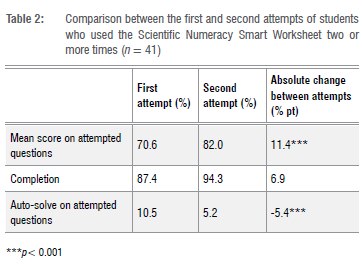 Students were permitted up to three attempts at the SNSW, in order to encourage more practice and skills development. It is important to note that students were required to submit the whole worksheet (at any level of completion) before they could embark on a subsequent attempt. The highest mark obtained from their attempts was used for their final assessment mark. Of the 210 students who consented to the study, 41 made at least two attempts at the resource. Only six completed the worksheet three times, so only their first two attempts are considered here. Table 2 shows the overall comparisons between the two attempts. See the supplementary material for the section-level breakdowns.