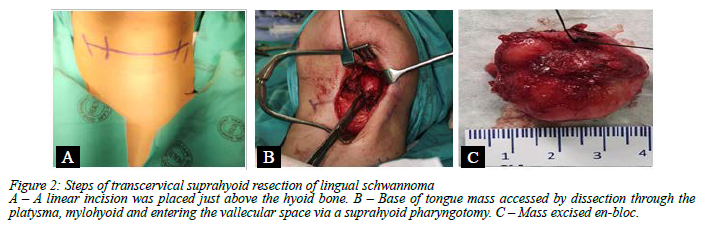 Following discussion with the patient, a temporary tracheostomy and a transcervical suprahyoid resection of the mass was performed. A linear incision was placed just above the hyoid bone (Figure 2A). The base of tongue mass was accessed by dissecting through the platysma, mylohyoid and entering the vallecular space via a suprahyoid pharyngotomy (Figure 2B). The lingual artery, lingual nerve and hypoglossal nerve was isolated. The mass was excised macroscopically en-bloc and sent for histopathology analysis (Figure 2C).
