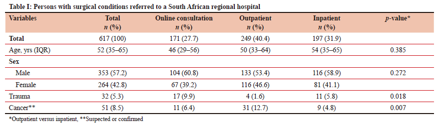 In the 12-month study period, 617 index PSC were referred via Vula Mobile App to WRH, the regional hospital from 23 health facilities. Overall, 264 (42.8%) were female, 353 (57.2%) were male, and the median age was 52 years (interquartile range (IQR), 35-65) (Table I). The proportion of trauma amongst inpatients was higher than in outpatients, (5.8% vs 1.6%, p = 0.018) however, a cancer diagnosis was more common in outpatients (4.8% vs 12.7%, p = 0.007) (Table I).
