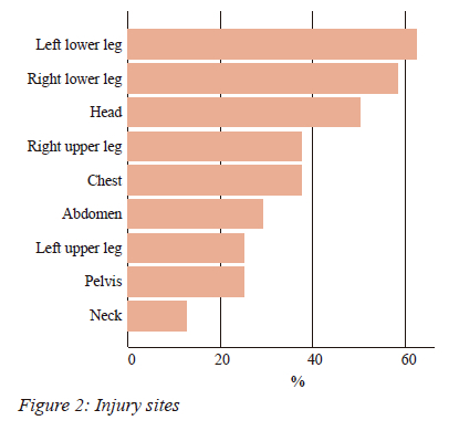 In terms of the anatomical regions injured, the left leg (62%) was amputated more often than the right leg. Most above-knee amputations started as below-knee procedures to formalise a partial amputation or non-viable mangled limb in the context of unstable physiology. The commonly associated other regions injured included the head (50%) and chest or abdomen (30-38%). Spinal fractures were uncommon. Figure 2 illustrates the frequently affected sites. Neck injury was much less common (16%).
