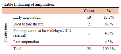 During the period under review, 2340 patients with major trauma were admitted to the TICU. One thousand eight hundred and eleven cases were blunt trauma and 529 were penetrating trauma. Twenty-three patients (1% of the total) who had an amputation in the context of polytrauma were identified and included in the analysis. The mean age was 34 years with a standard deviation of 13 years and a range from 5 to 55 years. The majority of amputees were in the age group 32-40 years. The sex-distribution was in keeping with the trauma male predominance at 73.9% male admissions.