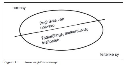 Ons kan op twee maniere die saak begripsmatig benader: ons kan eerstens terugskouend die artefakte in die tweede kolom van Tabel 1 (te wete: kursusse, assesserings, en taalreëlings) meet aan hoe hulle voldoen aan die vereistes wat die norme in die eerste kolom stel. Of ons kan vooruitskouend vanuit die vereistes kyk na hoeveel verskillende of verbeterde weergawes van die gebruiker-koppelvlak artefakte daar moontlik bedink kan word. Maar altyd wentel dit om die ontwerp van 'n taalingryping om 'n weerbarstige taalprobleem die hoof te bied. Daar is 'n wisselspel tussen bloudruk en uitvoering, tussen die norm vir ontwerp en die feitelike ontwerp.