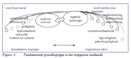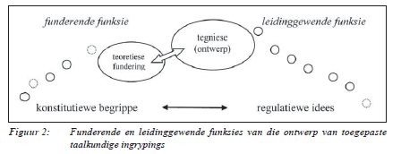 Benewens die aanduiding van die tegniese aspek as kwalifiserende funksie, is twee verdere onderskeidings in hierdie voorstelling relevant. Ten eerste is daar tesame met die deurslaggewende aard van die tegniese modus, ook 'n aanduiding dat die ontwerp gefundeer word met verwysing na die teoretiese onderbou daarvan. Die tegniese modus is die kenmerkende funksie van ontwerp, maar in die geval van die toegepaste taalkunde is die belangrike fondament daarvan geleë in die logies-analitiese aspek van ons ervaring. Hierdie twee funksies, die tegniese en die analitiese, is twee kernfunksies van ontwerp: 'n eerste bousteen en 'n eerste poolster. Die wisselwerking tussen hierdie twee terminale (in die sin van funderende en kenmerkende) funksies is van kernbelang in die toegepaste taalkunde. Die ontwerp van 'n kursus, die maak van 'n taalplan, of die opstel van 'n taaltoets vereis, soos ons reeds opgemerk het, uit die oogpunt van die toegepaste taalkunde altyd 'n teoretiese begronding. Kortom: ontwerp is die kern van wat ons die tegniese modus van ons ervaring kan noem, en verant-woordelike ontwerp benodig begronding. Die funksie van tegniese ontwerp, prominent in die aanwending van die tegniese verbeelding van die toegepaste taalkundige, lei wel die hele ontwerpproses. Die teoretiese onderbou is ondergeskik daaraan, maar essensieel. Dit kan die ontwerp by verdere nadenke tot verstelling en verandering beweeg. Daar is wisselwerking tussen tegniese leiding en logies-analitiese fundering; die twee kernfunksies beïnvloed mekaar, en is wederkerig.