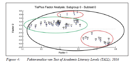 Die vraag vir die taaltoetsontwerper in hierdie geval is: is die rofweg drie groeperings van items uit verskillende subtoetse voldoende geïntegreer, om nog te kan voldoen aan die beginsel van tegniese eenheid? Die antwoord in hierdie geval was: die meer as 60 items in die toets het wel genoegsame homogeniteit, want hulle meet slegs een faktor (akademiese geletterdheid), alhoewel daar ook, soos uit ander analises sal blyk, gesonde differensiasie van subtoetse sal wees.