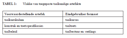Oorweeg ons daarna die geskakeerdheid van norme van verskillende funksionele aard (te vinde in taalbeleid, kurrikulum, of konstruk) en die konkrete, feitelike vergestaltings daarvan (in taalreëlings, taalkursusse en taaltoetse), word die definisie van die toegepaste taalkunde soveel gouer helder. Die sestal samehangende artefakte is elk óf 'n ontwerpvereiste ('n norm) óf 'n feitelike gestalte van 'n plan vir die betrokke ingrypings. In elk staan "ontwerp" sentraal (Weideman, 2017), en artefak word as wisselterm daarvoor gebruik vir die norm of die konkrete vorm wat die ontwerp aanneem, omdat dit bewustelik en met oorleg saamgestel word.