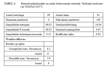 'n Verdere, eintlik oorbekende voorbeeld van tegniese reëlmatigheid of konsistensie is te vinde in metings van betroubaarheid van taaltoetse. Dit word in die reël gegenereer deur konvensionele statistiese analises wat die korrelasiekoëffisiënte van 'n taaltoets indekseer op 'n skaal van 0 (hoegenaamd nie betroubaar) tot 1 (volkome betroubaar). In Tabel 2 word die betroubaarheid van die Toets van Akademiese Geletterdheid vir Nagraadse Studente (TAGNaS) se 2017-aanwending aangetoon.