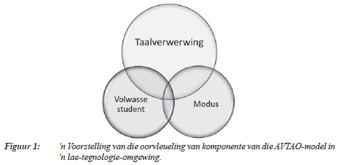 Hierdie drie komponente, naamlik "wat?" (taalverwerwing), "vir wie?" (die volwassene as student) en "hoe?" (die modus van aanbieding) is die kern van die voorgestelde model vir taalverwerwing in 'n laetegnologie-omgewing (soos die Suider-Afrikaanse konteks). Die literatuurstudie, data-insameling (vraelyste en onderhoude oor behoeftes (as voortoets)) en evaluering van 'n bepaalde kursus (as natoets), rig primêr die bespreking van elk van die drie komponente van die onderrigmodel. Die komponente funksioneer nie in isolasie nie. Die wie?-, wat?- en hoe?- komponente van die model beïnvloed mekaar wedersyds. Figuur 1 is 'n voorstelling van die wisselwerking en ideale oorvleueling tussen die komponente.