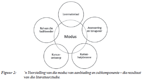 In die volgende afdeling word die derde kernkomponent, die modus van aanbieding, bespreek. Wat die modus betref, word aandag gegee aan die leermateriaal, assessering en terugvoer, kursushulpbronne, kursusontwerp en die rol van die fasiliteerder.