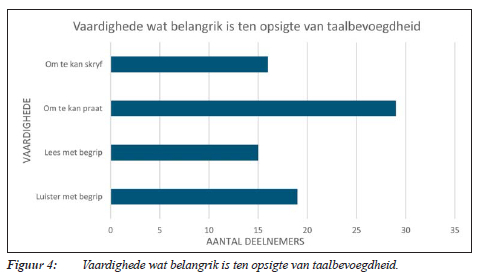 Taalbevoegdheidsontwikkeling word oor die algemeen beskou as 'n vaardigheid op vier gebiede: luister, lees, praat en skryf. Kennis van onder meer die klankstruktuur, woordeskat en sinstruktuur is nodig om hierdie bevoegdhede te ontwikkel (Common European Framework of Reference for Languages (CEFR), 2024). Volgens die Europese Referensiekader (ERK), die Amerikaanse Raad vir die Onderrig van Vreemde Tale (American Council on the Teaching of Foreign Languages (ACTFL)) en die Interagency Language Roundtable (ILR) moet al vier vaardighede ontwikkel word om kommunikatiewe bevoegdheid te bereik (Proficiency Scales, 2024; Masduqi, 2016:507; Pignot-Shahov, 2012:38). Daar word na die ERK verwys omdat daar tans geen ander geldige en betroubare raamwerk vir die meting van taalbevoegdheid, binne die Suider-Afrikaanse konteks, as toepaslike verwysingspunt is nie.