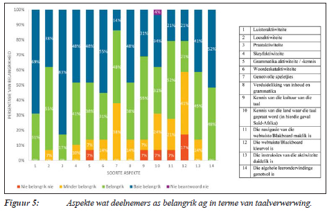 2. Dit is belangrik dat die kursushulpbronne en toepassings wat gebruik word afgestem moet wees op funksionering in 'n laetegnologie-omgewing en verder geskik moet wees vir taalverwerwing.