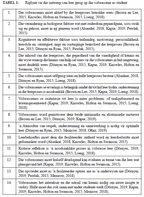 Die vier algemeen-bekende leerteorieë, naamlik behaviourisme, kognitivisme, konstruktivisme en humanisme het bygedra tot verskeie teorieë rakende volwasse-onderrig. Die prominentste volwasse-onderrig-teorieë het uit die humanistiese en konstruktivistiese benaderings ontwikkel en sluit andragogie, selfgerigte leer, transformerende leer en ervaringsleer in. Elkeen van hierdie teorieë lig verskillende aspekte van onderrig by volwassenes uit, maar toon ook ooreenkomste soos selfgerigtheid, motivering, ervaring, leerdergesentreerdheid en refleksie. Tabel 1 bevat 'n opsomming van die ooreenkomste wat daar in die verskeie teorieë, naamlik andragogie, selfgerigte leer, transformerende leer en ervaringsleer voorkom. Dit bevat ook ander affektiewe faktore om te oorweeg wanneer volwassenes onderrig word. Hierdie tabel dien as riglyn vir die aspekte wat uit die literatuur in ag geneem moet word in die ontwikkeling van 'n voorgestelde en optimale onderrigmodel vir taalverwerwing gerig op volwassenes.