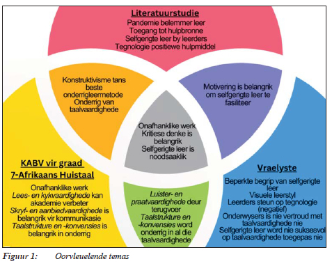 Uit die gekristalliseerde data, wat deur die literatuurstudie, 'n dokumentontleding van die KABV vir graad 7-Afrikaans Huistaal (DBO, 2011) en aanlyn oopeindevraelyste gegenereer is, is verskeie temas geïdentifiseer soos duidelik blyk uit figuur 1. Oorvleuelende temas is dat konstruktivisme tans die voorgeskrewe onderrig- en leermetode is en dat die onderrig van taalvaardighede belangrik is in die klaskamer. Terugvoer is noodsaaklik vir luister- en praatvaardighede en taalstrukture en -konvensies word in al die taalvaardighede onderrig. Motivering is van groot belang om selfgerigte leer van leerders te ontwikkel en onderwysers moet as fasiliteerders optree. Verder is onafhanklike werk in die klaskamer en die ontwikkeling van kritiese denkvaardighede belangrik vir die bevordering van selfgerigte leer in die graad 7-Afrikaans Huistaalklaskamer.