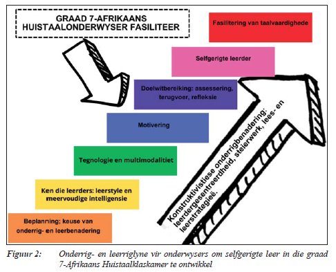 Die navorsingsbevindinge uit die dataontleding het gelei tot die samestelling van onderrig- en leerriglyne vir onderwysers om selfgerigte leer in die graad 7-Afrikaans Huistaalklaskamer te ontwikkel. Die voorgestelde onderrig- en leerriglyne word skematies in figuur 2 uitgebeeld en daarna bespreek.