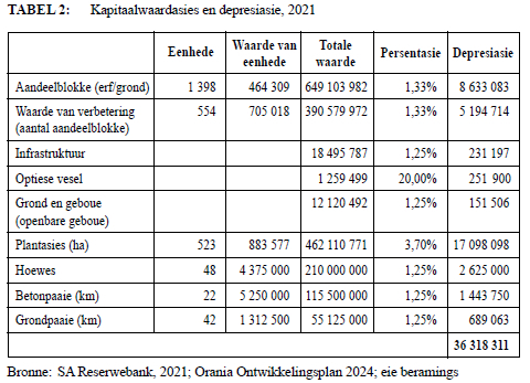 Die beraamde waarde van kapitaalbates en beraamde depresiasie van hierdie bates vir 2023 word in Tabel 3 getoon. Depresiasie op hierdie kapitaalbates vir 2023 is beraam op Φ42 636 450 (Φ42,6 miljoen). Orania se BGP vir 2023 word dus op Φ462,0 miljoen beraam.