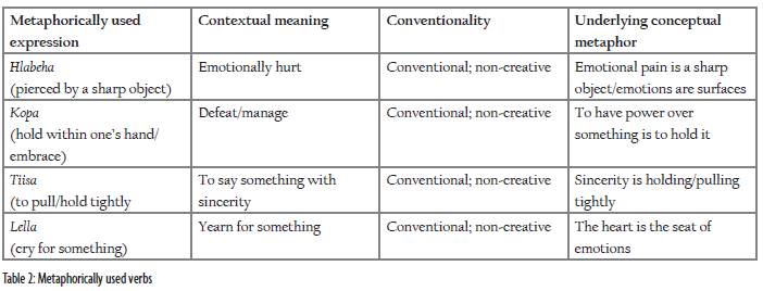 Other verbs are those that are based on the following conceptual metaphors: "Wounds are animals"; "Being surrounded by people is the same as being helped to dress by them""; "Control is a container"; "A situation is a location"; "A bad reputation is a stain and kingdom is a cloth." All the verbs that are based on these conceptual metaphors, similar to the conceptual metaphors themselves, are conventional and are used in non-creative ways. The use of these metaphors creates a text that has a style that is like that of other Sesotho texts and to that of texts written in the West (Dorst 222).