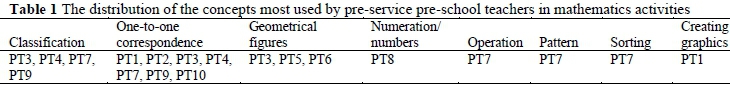 1) What are the concepts most used by pre-service preschool teachers in mathematics activities?