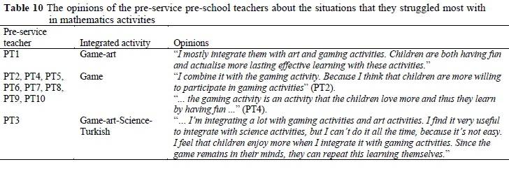 From Table 9 one can see that the pre-service pre-school teachers stated that they integrated mathematics activities mostly with games (f = 10), art (f = 2), science (f = 1) and Turkish (f = 1). It is clear that pre-service teachers have never integrated mathematics activities with music, preparation for reading and writing, movement and field trips. The pre-service pre-school teachers' opinions on the results in Table 9 were examined in detail (see Table 10).