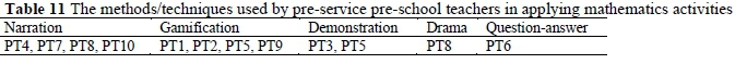 6) What are the methods/techniques used by pre-service pre-school teachers in applying mathematics activities?