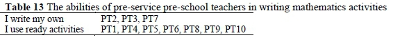 Table 13 shows that pre-service pre-school teachers mostly use ready-made activities in mathematics activities (n = 7), although some of them (n = 3) wrote their own activities. The pre-service pre-school teachers' opinions on the results in Table 13 were examined in detail (see Table 14).