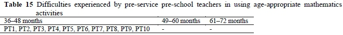 When Table 15 is examined, all pre-service pre-school teachers (n = 10) stated that they had difficulties in using mathematics activities with children of 36 to 48 months old. The pre-service pre-school teachers' opinions on the results in Table 15 were examined in detail (see Table 16).